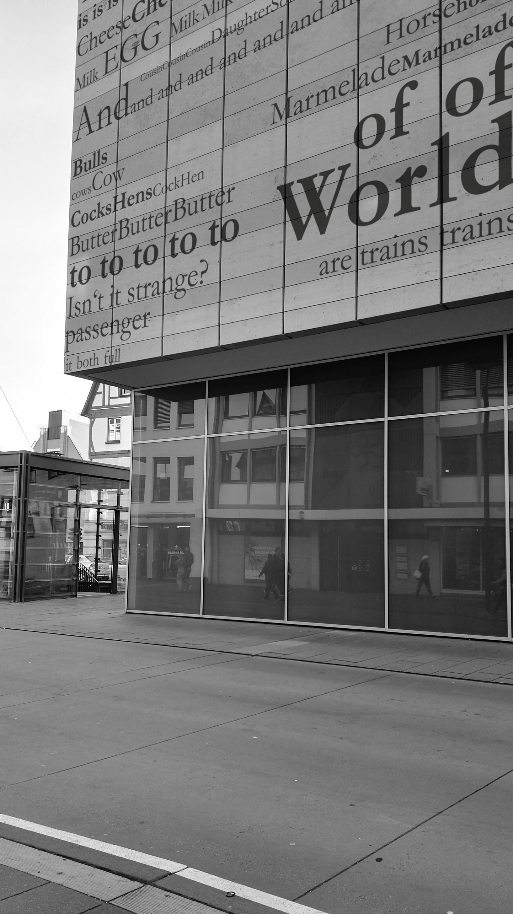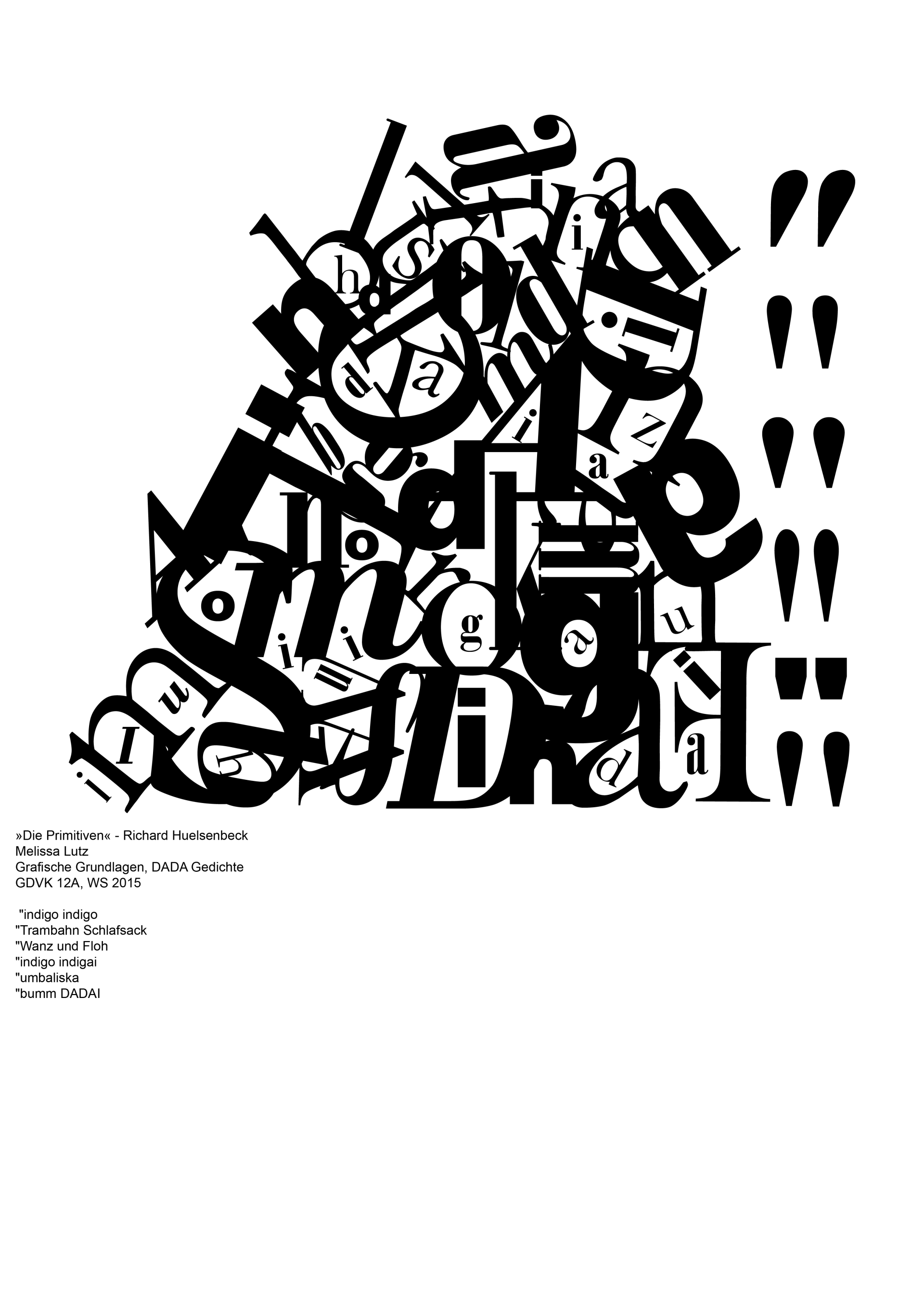 Diese Grafiken und Bilder entstanden in meinem ersten Semester und waren eine Übung zum verstehen Grafischer Grundlagen. Die Aufgabe war es, sich drei DADA Gedichte auszusuchen und diese grafisch darzustellen. Dabei sollte man verschiedene Schnitte einer zuvor ausgewählten Schriftart verwenden. Anschließend wurden diese Grafiken auf Flächen im urbanen Raum gemapt.