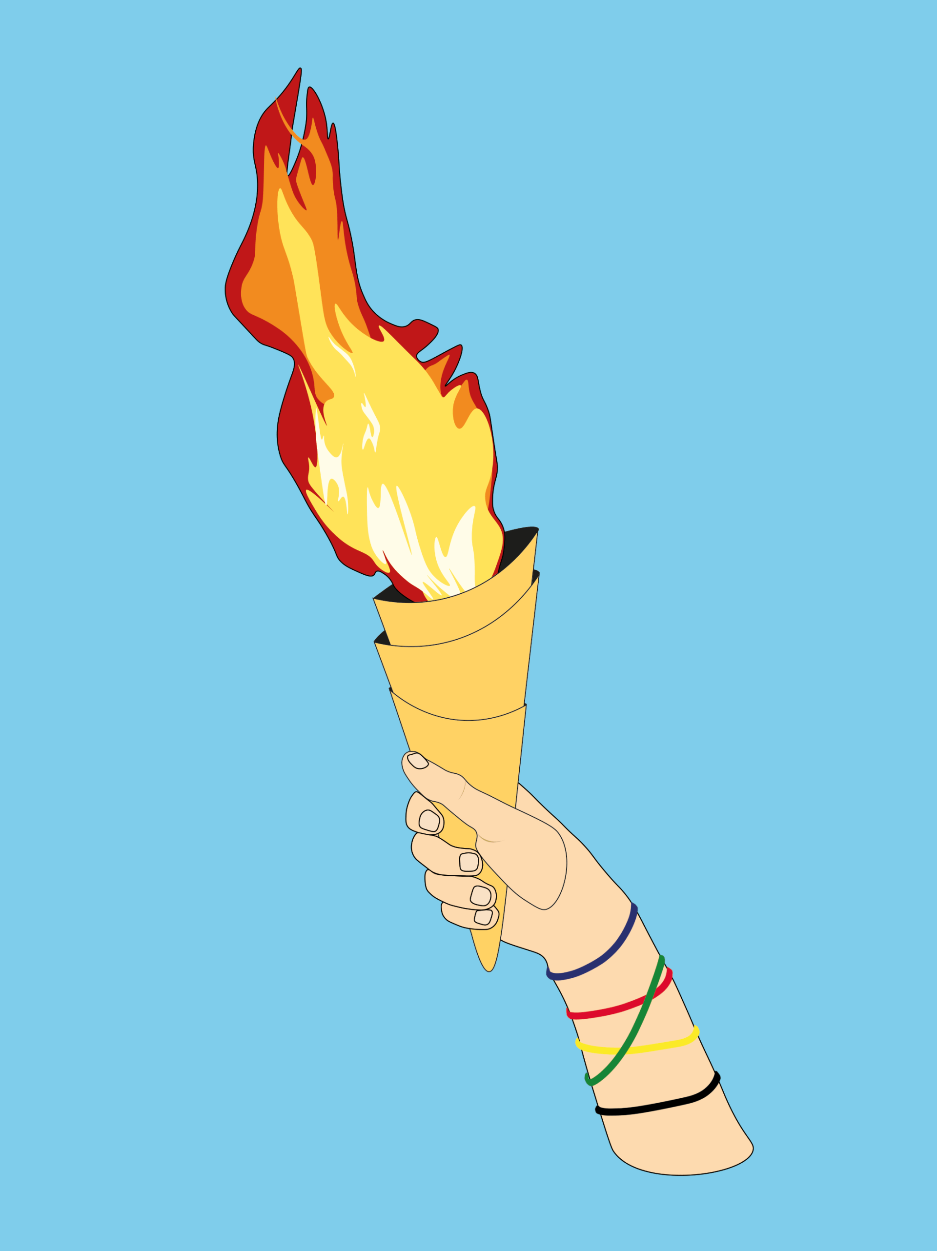 Mein Ansatz dazu war das Olympische Feuer, das das Herzstück der Spiele ist und schon Monate vorher durch die ganze Welt von Fackelträgern transportiert wird. Zusätzlich wird die Hand des Fackelträgers mit bunten Bändern geschmückt, die die Olympischen Ringe darstellen sollen.